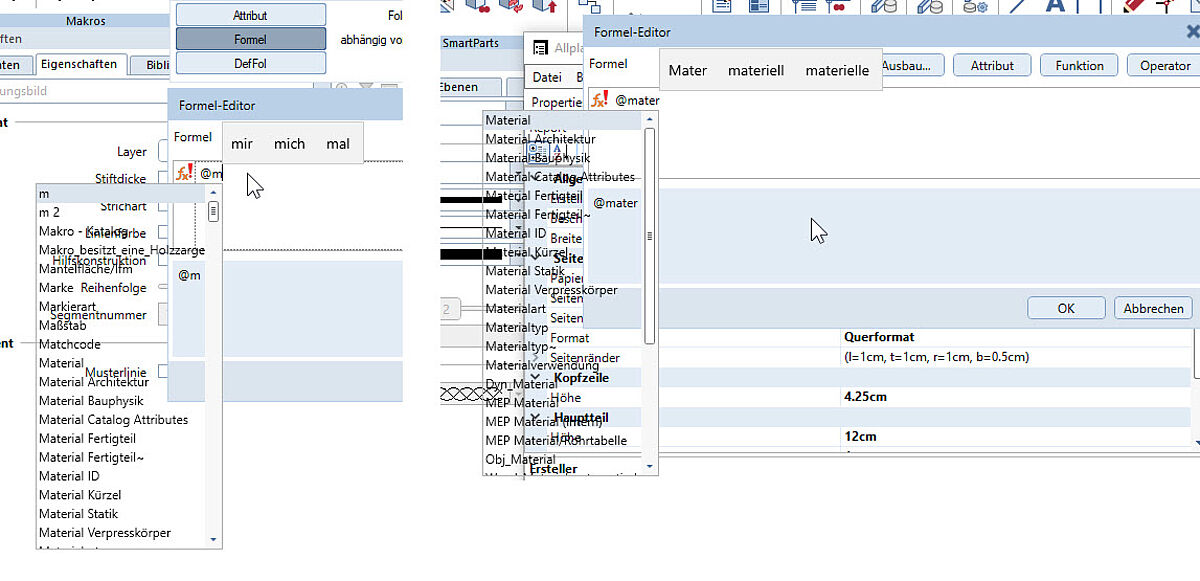 Versucht man eine Formel zu erstellen, zeigt sich - zumindest bei meinen Standardeinstellungen unter Windows 10 - die Auswahl der Attribute - nach Eingabe der ersten Zeichen eines Attributes - als deutlich zu transparent.